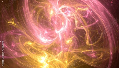 Obraz premium 銀河のエネルギーが交錯し、ピンクと金色の光が美しく広がる空間に、深い静寂と平和を感じる幻想的なビジュアル