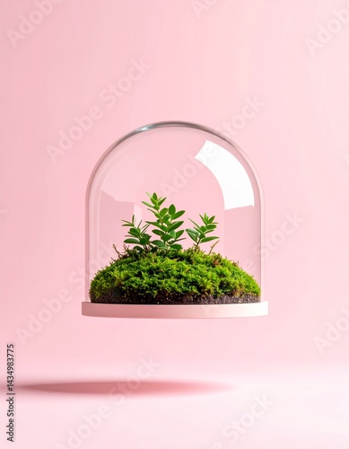 © EASY103, Fototapeta premium 淡いピンクの背景に浮かぶガラスドームの中の小さな苔テラリウム
