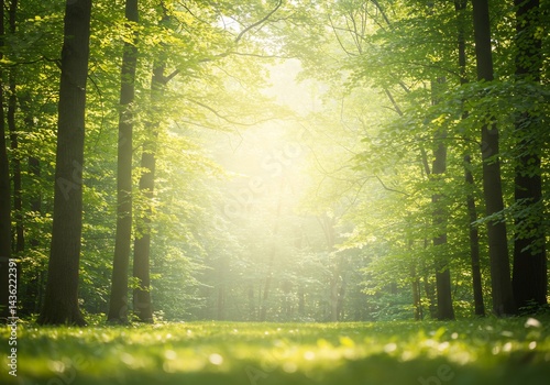 Obraz premium 緑輝く森道 優しい光が差し込む