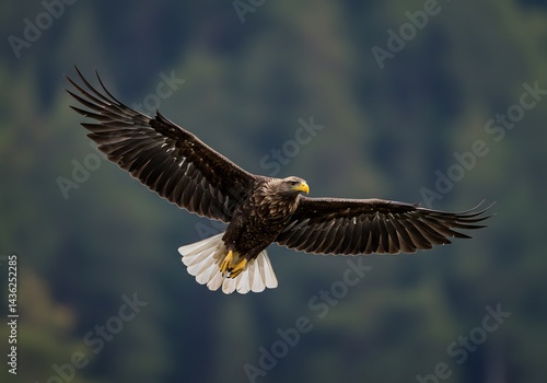 Fototapeta premium 力強く羽ばたくワシ 緑の森背景 雄々しい飛行