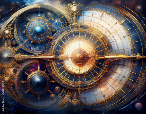 © 100ME, Obraz premium スチームパンク風の精巧なコンパスが中心に描かれ、周囲は水彩タッチの宇宙背景。古びた金属とインクのにじみが幻想的な雰囲気を演出