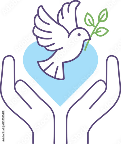 © Jam, Naklejka premium 잎사귀를 문 비둘기와 감싸는 두 손, 파란 하트