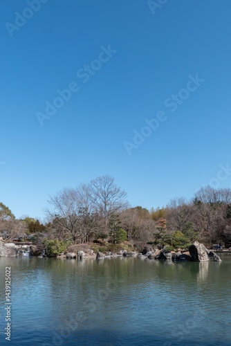 Obraz premium 早春の晴れ渡った青空 公園の池 滋賀県大津市びわこ文化公園