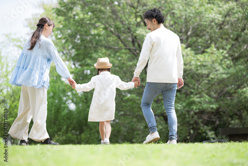 Obraz premium ファミリーが笑顔で手を繋ぐ歩く春夏のお出かけやアウトドアレジャーのイメージ 全身の後ろ姿の顔無し