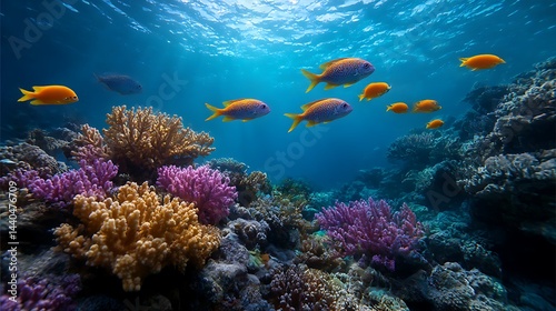 Obraz premium 色鮮やかなサンゴ礁と泳ぐ熱帯魚