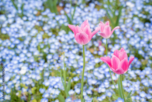 © yuka, Fototapeta premium ネモフィラとピンクチューリップ