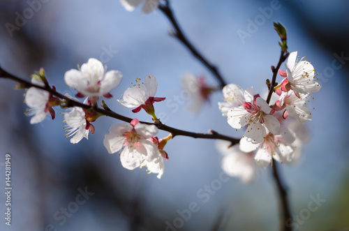 Obraz premium Красивые белые цветки распускаются на дереве весной. Солнечный свет освещает белые весенние цветки, которые распускаются на дереве, на фоне голубого неба.