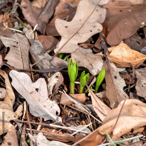 Fototapeta premium 落ち葉の布団から目覚めた若い芽が見せる命の輝き 落ち葉に包まれていた若芽が、ついに顔を出し、新しい世界に向かって伸びていく。