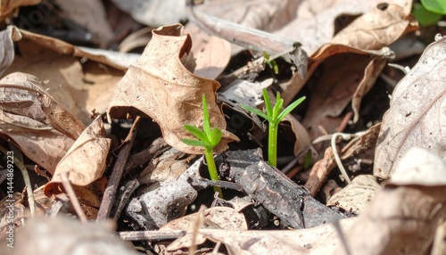 Fototapeta premium 落ち葉の布団から目覚めた若い芽が見せる命の輝き 落ち葉に包まれていた若芽が、ついに顔を出し、新しい世界に向かって伸びていく。