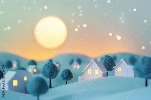 © mamio, Obraz premium パステルカラーの美しい夜の山並みと家々と大きなお月様