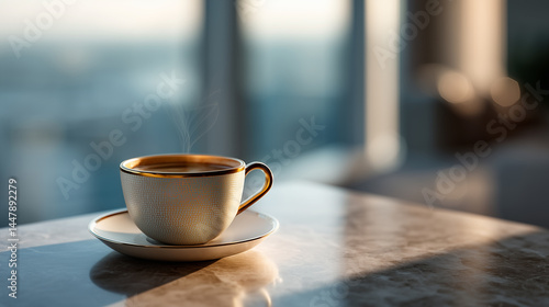 © minaduchi, Obraz premium 窓際のテーブルに置かれた金色の取っ手付きコーヒーカップ | 静けさの演出