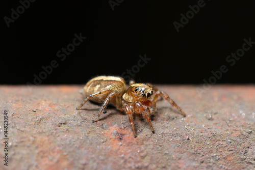 Fototapeta premium 錆びた手すりにかわいいデーニッツハエトリ蜘蛛のアップ(自然環境下マクロ撮影)
