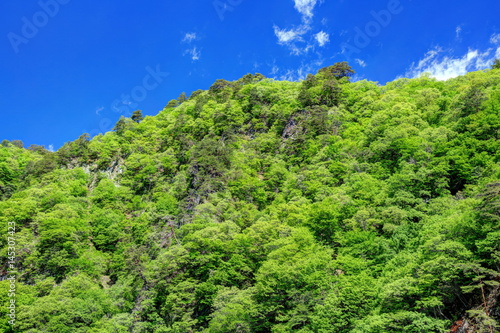 Obraz premium 新緑に覆われる吾妻峡屏風岩