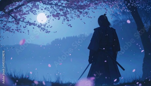 Obraz premium 満開の桜の中に佇むサムライの美学