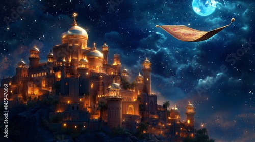 Naklejka premium 夜の宮殿と空飛ぶ絨毯のイメージ