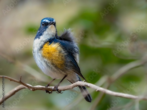 Obraz premium 木陰でのんびり羽繕いしているルリビタキの雄。ふわふわした羽毛の様子。