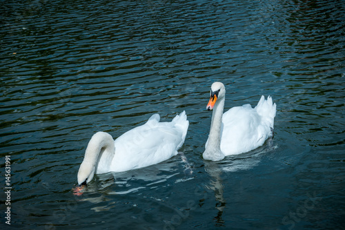 Naklejka premium Пара лебедей и озеро в городском парке