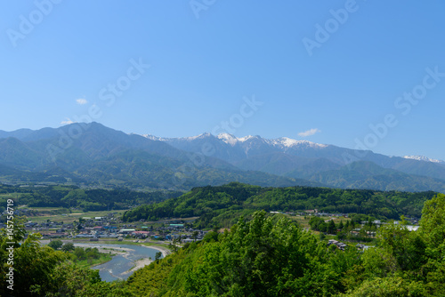 Fototapeta premium 長野 中央アルプスと伊那谷の田園風景