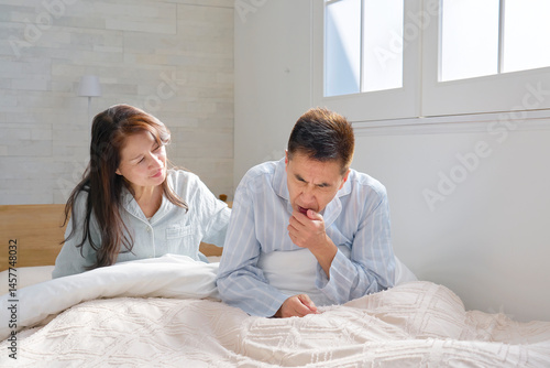© siro46, Fototapeta premium ベットの上で咳をする男性