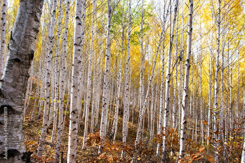 © Cokr, Obraz premium 가을 분위기의 잎이 노란 자작나무.