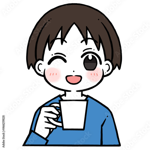 © 彩香 中山, Obraz premium コップを持つウインクで笑う男の子のイラスト