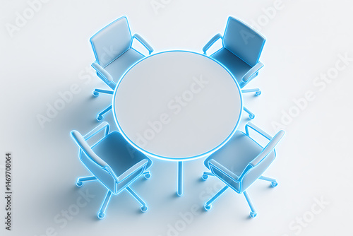 Fototapeta premium 白背景に青い光線で縁取られた円卓と椅子の会議スペース構成