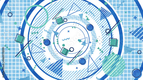 © Micke, Obraz premium 大きな円の上にメンフィス風の図形や模様が並ぶレトロな平面構成 - ブルー/透過背景