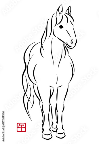 Obraz premium 美しい白馬の立ち姿のイラスト 墨絵風でお洒落な午年の年賀状素材