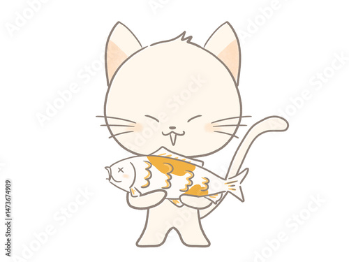 © rinm, Obraz premium 鯉を持って立つ白猫のイラスト