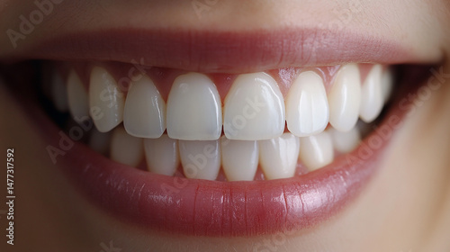 Fototapeta premium 白く整った歯と美しい笑顔をクローズアップで捉えた一枚。歯科医療やホワイトニング、口腔ケア、美容歯科などのコンテンツに最適です。