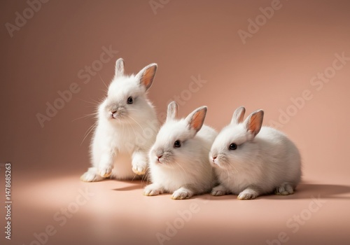 © NguyenHaiPhuong, Obraz premium ふわふわ白ウサギ三匹 可愛く並ぶ 優しい背景