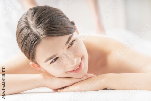 Fototapeta premium 明るい雰囲気のエステサロンでマッサージを受ける若い女性