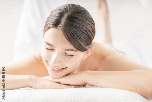 Fototapeta premium 明るい雰囲気のエステサロンでマッサージを受ける若い女性