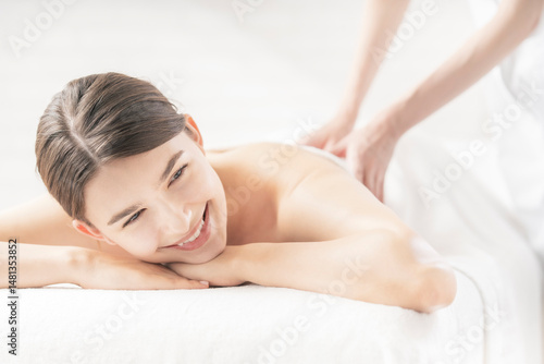 © TAGSTOCK2, Fototapeta premium 明るい雰囲気のエステサロンでマッサージを受ける若い女性