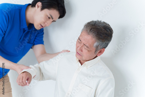 © polkadot, Obraz premium 肩が痛い高齢者男性とスタッフ