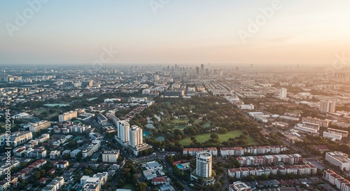 © NguyenHaiPhuong, Fototapeta premium 穏やかな夕暮れ 広がる都会 緑溢れる公園 高層ビル群