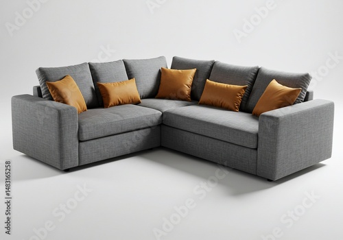 © NguyenHaiPhuong, Obraz premium 都会的モダンコーナーソファ 快適な座り心地 上品な灰色と金色クッション