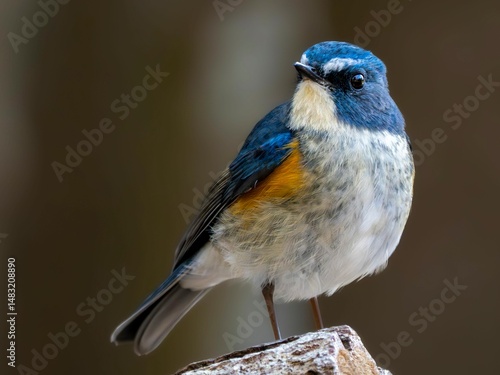 © STOCK THE WORLD, Obraz premium 森の中で周りを見渡しているルリビタキの雄の繊細で美しい羽毛の様子のクローズアップ