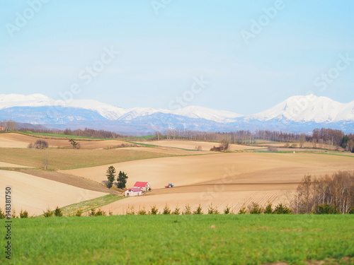 Obraz premium 雪が残る大雪山連邦と素敵な美瑛の風景
