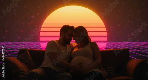 Naklejka premium 未来レトロな夕日 優しく寄り添う二人 幸せ満ちる妊娠