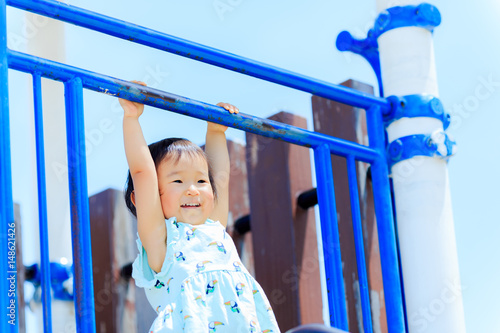 Fototapeta premium 公園の滑り台で遊んでいるかわいい子供