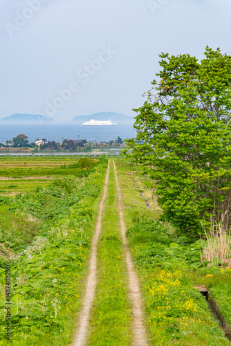 Obraz premium 春の田舎の景色 海の見える一本道の農道とフェリー 日本、青森