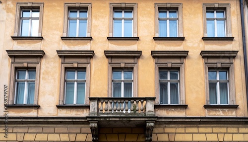Obraz premium 縦に一直線に並ぶ正方形窓が映える伝統的古い住宅のシンメトリックなファサード