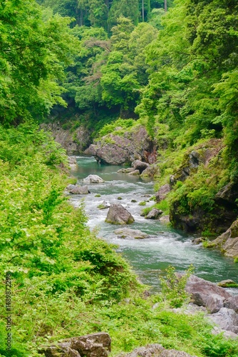 © Ruqing, Obraz premium 清らかな渓流が流れる美しい自然風景。緑に囲まれた静かな癒しの空間。