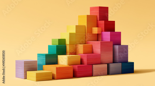 © minaduchi, Obraz premium 鮮やかな虹色のグラデーションで構成された木製ブロックのピラミッド | 幾何学的構造美
