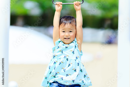Fototapeta premium 公園の遊具にぶら下がっているかわいい子供