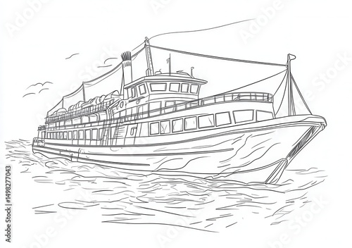 © 7sevenGr, Obraz premium 汽船のスケッチ、優雅な船旅、モノクロイラストレーション