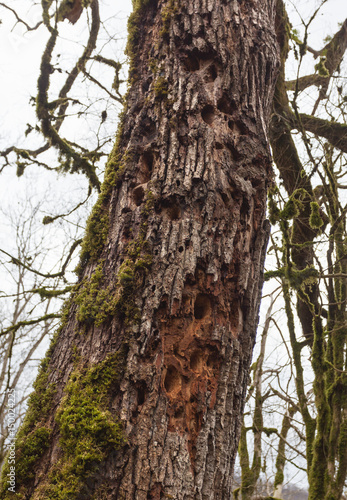 Fototapeta premium Дерево поврежденное вредителем. Видны следы работы дятла. Хостинская...