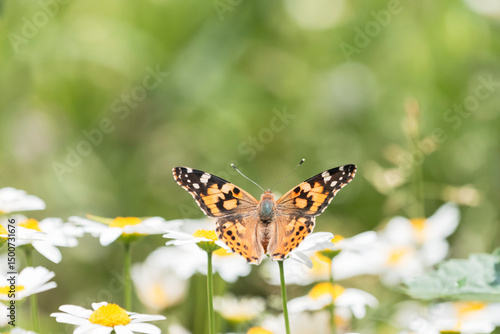 © imacoconut, Obraz premium ノースポールの花と宙を舞うヒメアカタテハ