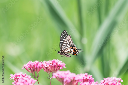 © imacoconut, Obraz premium ムシトリナデシコのピンクの花と宙を舞うアゲハ蝶